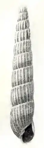 The very slender shell has an elongate conic shape. The length of the type specimen measures 5.9 mm. Its color is light horn yellow with the anterior half of the base and a narrow, pale brown band about one-fifth of the width of the space between the sutures. The band is situated about its own width posterior to the periphery. The whorls of the protoconch of the type specimen are decollated and probably the first two whorls of the teleoconch are missing. The remaining 9½ whorls of the teleoconch are flattened very high between the sutures, and narrowly shouldered at the summit. They are marked by closely crowded, quite regular, well rounded, almost straight, slightly protractive axial ribs;18 ribs occur upon the first four of the remaining turns; 20 upon the fifth to seventh; 22 upon the eighth, and 26 upon the penultimate whorl. The intercostal spaces are a little narrower than the ribs. They are marked by 13 strongly incised, subequal and subequally spaced pits. The suture is moderately constricted. The periphery of the body whorl is well rounded. The base of the shell attenuated, and well rounded. It is marked by the feeble continuation of the ribs which reach to the umbilical chink and five equal and equally spaced, moderately broad, shallow, incised lines of a rust brown color. The aperture is elongate oval. The posterior angle is acute. The outer lip is thin, showing the external sculpture within. The inner lip is slender, moderately curved, reflected over and adnate to the attenuated base for two-thirds of its length. It is and provided with a strong oblique fold at its insertion. The parietal wall is covered by a thick callus.[1]