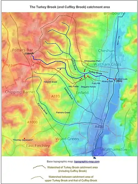 - Strictly speaking, the Turkey Brook catchment area includes that of its tributary, Cuffley Brook. The two streams merge near Forty Hill. But the catchment area of Cuffley Brook itself is quite large, and is dealt with separately on the Cuffley Brook page.