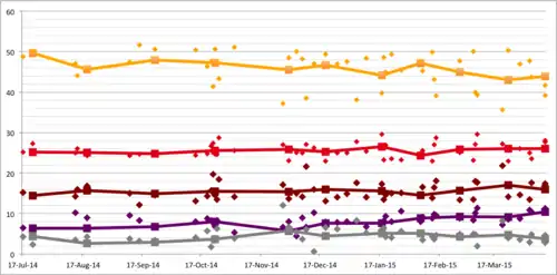 According to Habertürk, the party has proposed to field Kurdish candidates in the west and Turkish candidates in the east, which is the opposite of the demographic make-up of the country. The party is also expected to increase its popularity by offering candidacies to famous individuals, such as actor Kadir İnanır.[93] According to a private poll conducted by the HDP in January 2015, the party needs to gather around 600,000 more supporters by the general election in order to surpass the election threshold of 10% and win 72 MPs.[94][95] Polling organisations such as Metropoll, however, predict that the party would win around 55 MPs if they won more than 10%.[96] HDP candidates hoped that the victory of the left-wing SYRIZA in the 2015 Greek legislative election in January would result in a boost in popularity.[97]