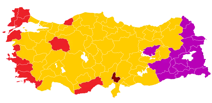 In all but three cases, electoral districts share the same name and borders of the 81 Provinces of Turkey, with the exception of İzmir, İstanbul and Ankara. Provinces electing between 19 and 36 MPs are split into two electoral districts, while any province electing above 36 MPs are divided into three. As the country's three largest provinces, İzmir and Ankara are divided into two subdistricts while İstanbul is divided into three. The distribution of elected MPs per electoral district is shown below.[23]