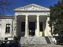 The facade is in neoclassical style, the columns and frieze recalling the Parthenon, the staircase imposing. The lobby is rectangular, with hallways leading to rooms in each direction, and a skylight on the roof. There is a basement, ground and upper floor, and three courtrooms. The prosecutor's office was located on the upper floor until 2002, when it moved into a new headquarters.[1]