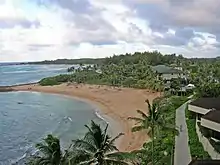 The resort is several miles away from surf spots including Waimea Bay, the Banzai Pipeline, and Sunset Beach. The two golf courses are named after designers Arnold Palmer and George Fazio. The Palmer Course was the site of the Turtle Bay Championship, a PGA Champions Tour Event held from 2001 through 2008,[18] and the Fazio Course has hosted the LPGA Tour's Hawaiian Open. The runways of the World War II era Kahuku Army Airfield have been absorbed into the fairways of the golf courses.[19] The James Campbell National Wildlife Refuge preserves a small pond adjacent to a golf course.[20]