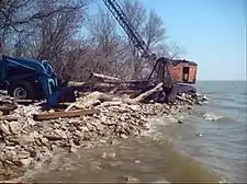 The island remains privately owned, and Turtle Island only has remnants of structures still standing.[3] In February 2002, the owner of the island attempted to build three new buildings on the island with the reported intent of using them for summer vacation rentals. Authorities in Monroe County issued a decree to stop the construction, because the owner failed to get the building permits to build on the Michigan side of the island.[7] The decree was ignored, but the structures were never completely finished before they were mostly destroyed by large ice packs during the winter of 2009.[2][8] Erie Township, which has jurisdiction over the Michigan half of Turtle Island, has planned to remove the now-destroyed structures from the island and clean up the remaining debris. This action has not taken place yet, because the cost of doing so would be too expensive. The township has continually debated on what to do with the island.[9]
