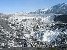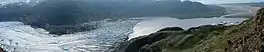 The Tustumena Glacier is a glacier located on the Kenai Peninsula of Alaska. The Tustumena Glacier begins in the Harding Icefield and makes its way down west for about 20 miles (32 km) until its terminus roughly 5 miles (8.0 km) before Tustumena Lake. The glacier is retreating[1] due to global warming.
