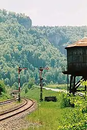 Hausen im Tal and Fridingen stations still have mechanical signal boxes of the standard design. The points, entry and exit signals and level-crossing barriers are set and operated by the signalman via wire-haulage. An electronic interlocking of the Lorenz type has been installed in Tuttlingen station since 2004 and is remotely controlled from the Karlsruhe signalling control centre.[4]