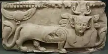 A relief depicting Tutu. He wears the headdress of a king, has a human face, the body of a lion, the wings of a bird, the tail of a cobra and he stomps on Sekhmet's arrows.