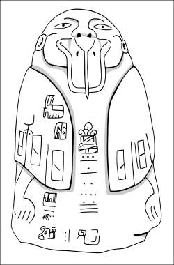 The Tuxtla Statuette is particularly notable in that its glyphs include the Mesoamerican Long Count calendar date of March 162 CE, which in 1902 was the oldest Long Count date discovered. A product of the final century of the Epi-Olmec culture, the statuette is from the same region and period as La Mojarra Stela 1 and may refer to the same events or persons.[3] Similarities between the Tuxtla Statuette and Cerro de las Mesas Monument 5, a boulder carved to represent a semi-nude figure with a duckbill-like buccal mask, have also been noted.[4]