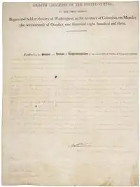 The Twelfth Amendment was proposed by the 8th Congress on December 9, 1803, when it was approved by the House of Representatives by vote of 84–42,[15] having been previously passed by the Senate, 22–10, on December 2.[16] The amendment was officially submitted to the states on December 12, 1803, and was ratified by the legislatures of the following states:[17]