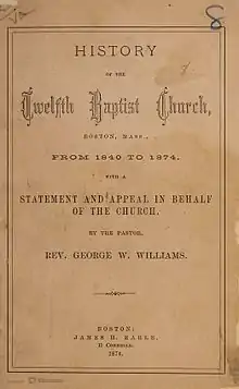 - Williams, George W. (1874). "History of the Twelfth Baptist Church, Boston, Mass., From 1840 to 1874. : With a Statement and Appeal in Behalf of the Church". Boston: James H. Earle.