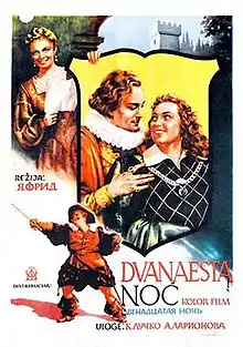 Twelfth Night (Russian: Двенадцатая ночь, transliteration Dvenadtsataya noch) is a 1955 Soviet comedy film by Lenfilm based on Shakespeare's play Twelfth Night, or What You Will. The script was written by Yan Frid. The film was released in the Soviet Union on 21 November 1955, and in the United States on 3 March 1956.