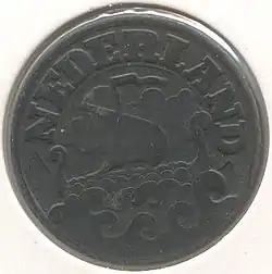 | German occupation coin | Utrecht | Zinc | Stylized sailing ship | Value and mint year between two twigs | Smooth with no edge lettering | 1941-1943 |