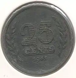 | Wilhelmina | Utrecht and Philadelphia | Silver | Queens head to the left | Value and mint year between two bonded oak branches | Reeded with no edge lettering | 1926(U), 1928(U), 1939(U), 1940(U), 1941(U and P), 1943-1945(P) |