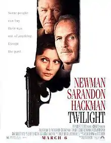 Twilight is a 1998 American neo-noir[2] thriller film directed by Robert Benton, written by Benton and Richard Russo, and starring Paul Newman, Susan Sarandon, Gene Hackman, Reese Witherspoon, Stockard Channing, and James Garner. The film's original score was composed by Elmer Bernstein. It received mixed reviews from critics and was a box office bomb, grossing $15.1 million against its $20 million budget.