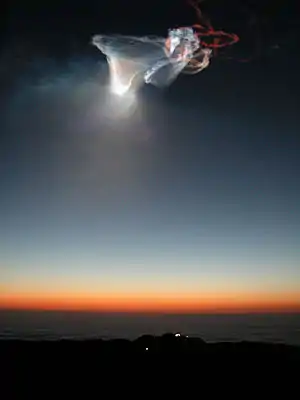 - On Dec. 22, 2017 a bright plume from a Falcon 9 rocket launching the Iridium NEXT 31-40 satellites from Vandenberg Air Force Base was observed. The launch occurred during sunset which caused "jaw-dropping views" of the ascent to space.
