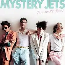 "Two Doors Down" is the second single from the Mystery Jets album Twenty One and it features a saxophone solo by Nik Carter[1] (of The Blackjack Horns). The single became their second highest-charting single in the UK Singles Chart, peaking at #24, second to "The Boy Who Ran Away" which charted one place higher at #23. In October 2011, NME placed it at number 100 on its list "150 Best Tracks of the Past 15 Years".[2]