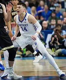 Herro averaged 14.0 points, 4.5 rebounds, and 2.5 assists as the only player to start in all 37 games for the Kentucky Wildcats.[2] On February 27, 2019, he scored a collegiate career-high 29 points, making 9 of 10 field goals and all of 6 free throws, to lead the Wildcats to a comeback victory over the Arkansas Razorbacks, 70–66.[7] Among other distinctions earned, he was named an All-Freshman First Team selection by Basketball Times as well as the Southeastern Conference Rookie of the Year by the Associated Press.[2] On April 12, 2019, Herro declared for the 2019 NBA draft, forgoing his final three years of college eligibility and hiring an agent. He was listed as a mid-first-round selection in most mock drafts.[8]