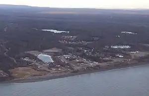 A Dena'ina Alaska Native village at Tyonek was noted by the explorer James Cook in 1778. The Lebedev-Lastochkin Company, a Russian fur trade venture, maintained a small trapping station on the site of Tyonek.[3] A detachment of the Vancouver Expedition under Joseph Whidbey visited the trading post in May 1794. Whidbey found that the LLC maintained "one large house, about fifty feet long, twenty-four wide, and about ten feet high; this was appropriated to the residence of nineteen Russians..."[4] A smallpox epidemic in the late 1830s killed about half the population. Tyonek became a major port during the Resurrection Creek gold rush of the 1880s, but declined after the founding of Anchorage on the other side of Cook Inlet in 1915. Tyonek was moved to its current site when the original village, located on lower ground, flooded in the 1930s.