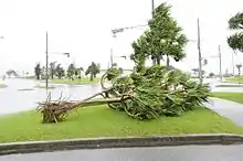 Winds from Chan-hom were strong enough to knock down street signs across Zhejiang, as well as destroying an unoccupied building in Cixi City.[56] The storm's heavy rainfall caused a landslide in Ningbo and necessitated flood gates to be opened.[57] Also in the city, storm rains caused a hotel roof to collapse, killing one person and injuring two.[58] Throughout Zhejiang, Chan-hom wrecked 700 homes and damaged another 1,400. In neighboring Jiangsu, 300 homes were damaged or destroyed, causing ¥120 million (US$19.3 million) in economic losses.[59] The storm wrecked greenhouses and irrigation systems while also damaging crops.[60] Storm impacts mostly affected agriculture and transportation in the country;[61] over 200,000 ha (490,000 acres) of crop fields were impacted.[62] In the Nanhui District of Shanghai, 20% of peaches and 40% of pears were lost after being damaged by the storm's winds.[63] In Shanghai, the winds knocked down over 3,000 trees.[53] The high agriculture damage – estimated at ¥3.62 billion (US$582.9 million) – was mostly due to the typhoon's concurrence with the local harvesting of vegetables and melons.[53] Overall, Chan-hom affected 3.9 million people in eastern China, causing about ¥9.84 billion (US$1.58 billion) in damage.[45]