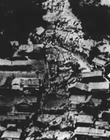 In the prefecture, Chita Peninsula and the eastern portion of Mikawa caused some widespread inundation damages due to the Yadagawa and Toyo River, which overflowed that day.[19] In the western half of the Owari Province, 4 fatalities were reported and over 9,267 households affected by flooding.[19] Eight railway lines also suffered damages.[19] Another river overflowed, submerging over 2,196 houses and 5,900 buildings and establishments.[20] The Mito River's left embankment was destroyed by strong currents, flooding wards, and establishments near the area.[21]