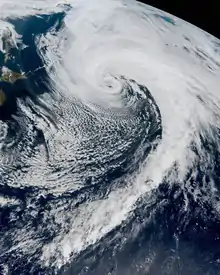 As an extratropical cyclone, Surigae began to undergo explosive cyclogenesis on April 26, with its central pressure falling 44 hPa (mbar; 1.3 inHg) within 24 hours, while rapidly tracking northeastward.[49] While located to the east of Hokkaido, the system's ten-minute maximum sustained winds reached 130 km/h (80 mph) at 18:00 UTC that day,[50] and its central pressure bottomed out at 944 hPa (mbar; 27.88 inHg) six hours later.[51] Late on April 27, Surigae's remnant started to weaken, while turning eastward. On the next day, the system's forward motion significantly slowed down. On April 30, Surigae underwent a center reformation, with the original center of low pressure dissipating, and a new low-pressure center forming shortly afterward, which quickly dominated the system.[52] Afterward, Surigae's remnant continued moving eastward, while gradually weakening, before turning northeastward on May 1. On May 2, Surigae's remnant was absorbed into another extratropical cyclone, just south of the Alaskan Panhandle.