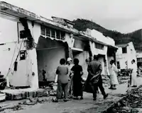 The typhoon Wanda is routed in Hong Kong near Cheung Chau, most parts of Hong Kong was in the right side of it, so the strong wind blew the wave into Tolo Harbour made the sea level rose, therefore Sha Tin (area near Tolo Harbour) became the hardest hit.[5][6] Since a large number of people settled in squatter huts on low-lying coastal areas or precarious slopes and fishermen lived in fishing boats, it caused large casualties when the typhoon hit Hong Kong. Some of survivors claim that the huge waves covered up their homes, sweeping the squatter huts and the home is dumped in front of them. They had to run to the railway station in a higher sea level, but the flood was also deep in the knees.[7][8] It is estimated that every 5 squatter huts had 1 was destroyed or damaged by the typhoon in Sha Tin, which is one of the gathering place of squatter huts in Hong Kong at that time, approximately 3,000 squatter huts damaged in total.[3] The road was blocked by a large number of damaged squatter huts and needed the British army to help to rescue the residents and clean up the road.[9] The heavy flooding increased the hardness of the rescue and clean up, there were 869 acres of farm land were flooded with sea water, over 30 percent (277 acres) were in Sha Tin, almost 65 percent (179 acres) of the low lying farm in Sha Tin were still affected two months later.[3] The shops and store were also heavily damaged by the flood, many goods from the store were drifting on the street and it was difficult for them to reopen in short term.[10]