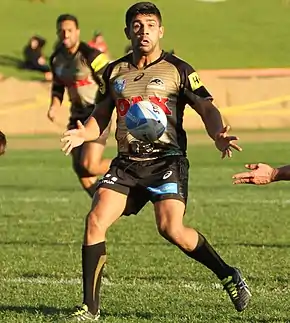 On 13 February, Peachey again played for the Indigenous All Stars against the new World All Stars in the 2016 All Stars match, playing off the interchange bench in the 12-8 loss at Suncorp Stadium.[22] On 8 May, he played for City Origin against Country Origin, where he started at lock in the 44-30 win in Tamworth.[23] In round 10, against the New Zealand Warriors, he scored a hat-trick of tries in the 30-18 win at AMI Stadium.[24] In the next match, in Round 11 against the Gold Coast Titans, with scores at 24-all, Peachey went from hero to zero after he dropped a pass from Peter Wallace and didn’t dive on the ball. Gold Coast halfback Ashley Taylor picked up the ball and raced downfield before Anthony Don acrobatically dived over in the corner one play later to seal a bizarre 28-24 win at Penrith Stadium.[25] In July 2016, Peachey was axed from the Penrith squad for their Round 18 clash with the Cronulla-Sutherland Sharks after he returned training late after a night out in Cronulla. Peachey had planned to head back to Penrith in the morning but slept in and attempted to make it to training on time by catching a taxi with the trip costing him $250 and arriving in the clothes he was wearing the night before with no training gear. He eventually played in the Panthers NSW Cup team for the week.[26] Peachey returned in the next match, playing at centre and scoring a try in the 22-18 win.[27][28] After Peta Hiku and Dean Whare suffered season ending knee injuries at the start of the season, Peachey was shifted from being a bench utility to centre.[29] Peachey finished the 2016 NRL season with him playing in 24 matches and scoring 13 tries for the Penrith club.