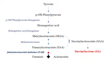 Fumarylacetoacetate hydrolase (FAH) is the final enzyme in the tyrosine metabolic pathway.[1] The mutation of FAH enzyme results in nonfunctional FAH in all cells expressing this gene and thus metabolizing tyrosine is impaired. FAH catalyzes the conversion of fumarylacetoacetate to fumarate and acetoacetate. Loss of FAH results in the accumulation of upstream compounds in the catabolic pathway. These include maleylacetoacetate (MAA) and fumarylacetoacetate (FAA). MAA and FAA are converted to succinylacetoacetate (SAA) which is then catabolized to succinylacetone (SA).[2]