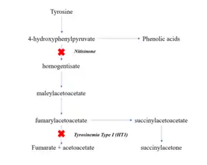 The primary treatment for type 1 tyrosinemia is nitisinone and restriction of tyrosine in the diet.[6] Nitisinone inhibits the conversion of 4-OH phenylpyruvate to homogentisic acid by 4-Hydroxyphenylpyruvate dioxygenase, the second step in tyrosine degradation. By inhibiting this enzyme, the accumulation of the fumarylacetoacetate is prevented.[10] Previously, liver transplantation was the primary treatment option and is still used in patients in whom nitisinone fails.