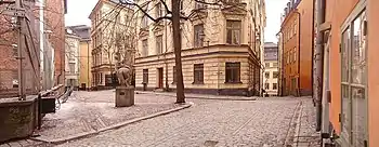 On either side of the street was the Blackfriars monastery from the 1330s to the Reformation (1520-1530). Archaeological excavations in the area have unveiled the remains of the monastery's wall under the present streets. In the southern end of Tyska Stallplan several such traces have been discovered, and in Prästgatan, south of the street, lines of cobble stones have been used to indicate the former extent of the monastery.[1]