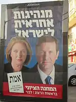 Later that year, Livni founded a new party, Hatnuah,[19] to compete in the 2013 elections, after which she was appointed Justice Minister in the Thirty-third government of Israel, again leading a new round of Israeli–Palestinian peace talks. In December 2014, a number of policy disputes within the government led Benjamin Netanyahu to dismiss Livni from his cabinet and call new elections. In the 2015 election, Livni joined forces with Labor Party leader Isaac Herzog to create the Zionist Union, a unified bloc of their two parties. In January 2019 Avi Gabay announced that Labor would not run with Hatnuah in the April 2019 Israeli legislative election. On 18 February 2019, following several weeks of poor poll results, Livni announced her retirement from politics as well as Hatnuah's withdrawal from the election.[20]