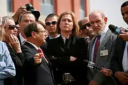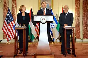 In December 2009, Livni travelled to Paris and met with French president Nicolas Sarkozy. "Time is against us," she told reporters following talks at the Elysee Palace that also touched on Iran. "We discussed the need to re-launch the peace process between Israel and the Palestinians, and I believe that this is part of Israel's interest to relaunch the negotiations from the point at which we stopped basically a year ago."[89]
