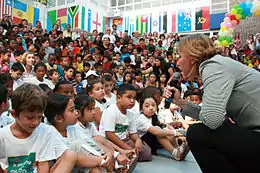 On 8 October 2009, Livni was honored by Yale University as a Chubb Fellow for her work and the inspiration spurred by her activities. She is the third Israeli leader to receive this honor after Shimon Peres and Moshe Dayan. The list also includes former U.S. Presidents Jimmy Carter and Bill Clinton. Livni referred to the Goldstone Report accusing Israel of committing war crimes in Gaza, and said there was a huge ethical gap between those seeking to murder children in their homes and those unintentionally harming civilians used by terrorists as human shields. Referring to the Israeli shelling of several UN schools in Gaza where thousands of civilians were taking shelter during the 2008–2009 Israel–Gaza conflict, Livni insisted that she "regret(s) every civilian casualty, but what happened at the UN school was not a mistake."[80][81] Addressing the peace process, Livni said Israel is not involved in it as a favor to anyone, but that it is in the interest of all parties. At her next stop in Miami, Livni became the first Israeli woman to receive the International Hall of Fame Award from the International Women's Forum.[82][83]