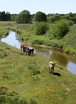 Užava begins between Gudenieki and Basu manor in Gudenieki Parish. It flows along the Piemare and Ventava plains in a north-eastern direction. Most of the flow, except for the section between Tērande and Sise, is regulated and river bed is straightened. As a result of land development and drainage, polder was built along the river. River discharges into the Baltic sea below the village of Užava.