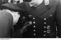 ![]() U-boat War Badge seen on the tunic of a sailor being presented with the German Cross in gold. | |
