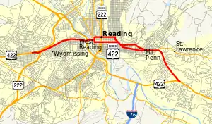 U.S. Route 422 Business (US 422 Bus.) is a 7.29-mile-long (11.73 km) business route of US 422 located in the Reading, Pennsylvania area. The route is one of four auxiliary routes of US 422 in Pennsylvania. Its western terminus is at an interchange with US 222 and US 422 in Wyomissing. Its eastern terminus is at an interchange with US 422 in Reiffton. US 422 Bus. heads east from US 222/US 422 along Penn Avenue, passing through Wyomissing and West Reading. The route has an interchange with the US 422 freeway before it crosses the Schuylkill River into Reading. US 422 Bus. passes through downtown Reading on the one-way pair of Franklin Street eastbound and Washington Street westbound, intersecting the southern terminus of Pennsylvania Route 183 (PA 183) and crossing US 222 Bus. The business route heads into the eastern part of the city southeast on Perkiomen Avenue before following the one-way pair of Perkiomen Avenue eastbound and Mineral Spring Road westbound into Mount Penn. US 422 Bus. continues along Perkiomen Avenue to St. Lawrence, where it intersects the western terminus of PA 562 and turns southeast. The route passes through Reiffton before it merges into eastbound US 422.