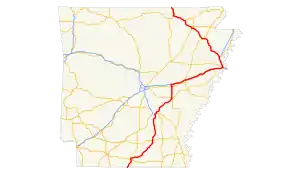 U.S. Route 63 (US 63) is a north-south U.S. highway that begins in Ruston, LA. In the US state of Arkansas the highway enters the state from Louisiana concurrent with US 167 in Junction City. The highway zigzags through the state serving the major cities of Pine Bluff, West Memphis and Jonesboro. The highway exits the state at Mammoth Spring traveling into Missouri.