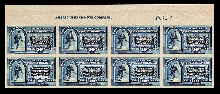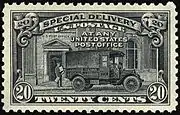 In 1885 Congress enacted the use of "a special stamp of the face valuation of ten cents ... [that] when attached to a letter, in addition to the lawful postage thereon ... shall be regarded as entitling such letter to immediate delivery."[1] The first Special delivery stamp was printed by the American Bank Note Company and issued on October 1, 1885. It could not be used to prepay postage or any other service. The stamp bears the words "Secures immediate delivery at a special delivery office,". In 1886 the Special Delivery service was expanded to all post offices and a new stamp was designed. The revised stamp was identical to the first issue of 1885 but instead bore the statement "Secures immediate delivery at any post office." The release of the revised stamp was delayed by the Post Office until 1888, however, allowing supplies of the first issue to be sold beforehand.[2] But the usage of such stamps had their drawbacks. Special Delivery only served communities whose population was over 4,000 people and could not guarantee delivery by a specific time. To be valid the Special Delivery stamp had to be affixed to the envelope along with all other postage and could not be used to prepay regular and airmail postage.[1]