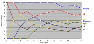- Head-to-head point differential: UST +35, FEU –13, Ateneo –22; second-seed playoff: FEU 49–48 Ateneo