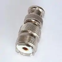 The UHF connector[4] is a name for a threaded RF connector. [5][6] The connector design was invented in the 1930s for use in the radio industry, and is a shielded form of the "banana plug".[7][8][4] It is a widely used standard connector for HF transmission lines on full-sized radio equipment, with BNC connectors predominating for smaller, hand-held equipment.[8]