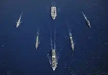 In the Gulf of Aden, the carrier strike group met with two U.S. Navy task groups, Carrier Strike Group 5 headed by USS Ronald Reagan and USS Iwo Jima's Amphibious Ready Group.[36] The carrier strike group then exercised with the Indian Navy in the Bay of Bengal before exercising with the navies of Singapore, Malaysia and Thailand in the Strait of Malacca.[37][38]