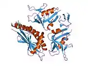 UL16 binding protein 3 (ULBP3) is a cell surface glycoprotein encoded by ULBP3 gene located on the chromosome 6.[3][4] ULBP3 is related to MHC class I molecules, but its gene maps outside the MHC locus.[3][4] The domain structure of ULBP3 differs significantly from those of conventional MHC class I molecules. It does not contain the α3 domain and the transmembrane segment. ULBP3 is thus composed of only the α1α2 domain which is linked to the cell membrane by the GPI anchor.[3][4] It functions as a stress-induced ligand for NKG2D receptor.[3]