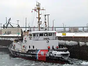 The 140-foot Bay-class tugboats operated primarily for domestic ice breaking duties. They are named after American bays and are stationed mainly in the northeast United States and the Great Lakes.