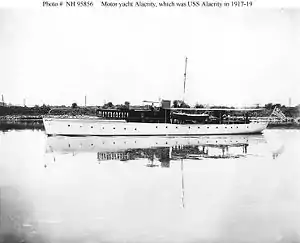USS Alacrity (SP-206) was a steel cruising yacht that served in the US Navy as a section patrol craft. It was built by Pusey & Jones at Wilmington, Delaware for W. A. Bradford in 1910 then sold to John H. Blodgett of Boston.