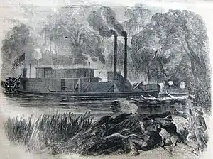 While on such a mission, the gunboat commanded by Acting Ensign James F. Perkins struck a snag in Lake Maurepas at the mouth of the Amite River early on the morning of April 7, 1863. Throughout that day, her small crew assisted by Union soldiers of the 6th Michigan Volunteers fought off Confederate guerrilla attacks while also jettisoning equipment to lighten ship. However, even sacrificing her bow gun and emptying her boiler failed to refloat Barataria by sunset.