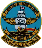 USS Bon Homme Richard (CV/CVA-31) was one of 24 Essex-class aircraft carriers completed during or shortly after World War II for the United States Navy. She was the second US Navy ship to bear the name, the first one being named for John Paul Jones's famous Revolutionary War frigate by the same name. Jones had named that ship, usually rendered in more correct French as Bonhomme Richard, to honor Benjamin Franklin, the American Commissioner at Paris, whose Poor Richard's Almanac had been published in France under the title Les Maximes du Bonhomme Richard.