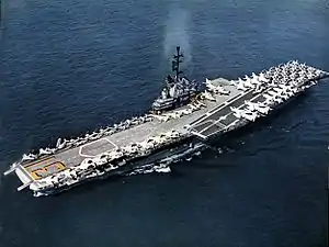Admiral George Stephen Morrison, father of The Doors lead singer Jim Morrison, flew his flag on Bon Homme Richard. Popular myth has it that he had some involvement in the Tonkin Gulf Incident, because he was commander of the U.S. naval forces in the Gulf of Tonkin during the Gulf of Tonkin Incident of August 1964.[5] The aircraft carrier involved in the incident was the Ticonderoga.[6] The Vietnam War escalation in early 1965 brought Bon Homme Richard into a third armed conflict, and she deployed on five Southeast Asia combat tours over the next six years. Her aircraft battled North Vietnamese MiGs on many occasions, downing several, as well as striking transportation and infrastructure targets. Occasional excursions to other Asian areas provided some variety to her operations. Carrier Air Wing 21 (CVW-21) joined the Bonnie Dick for the 1967 deployment to Vietnam. CVW-5 was aboard again for the last three deployments in 1968, 1969, and 1970. Bon Homme Richard was ordered inactivated at the end of her 1970 deployment. She was decommissioned on 2 July 1971, becoming part of the Reserve Fleet at Bremerton, Washington. Adm. Morrison was the keynote speaker at the Decommissioning Ceremony on 2 July 1971 which was one day before his estranged son, Jim, died in Paris, France.[7]