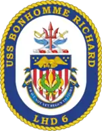 USS Bonhomme Richard (LHD-6) was a Wasp-class amphibious assault ship of the United States Navy commissioned on 15 August 1998. Like the previous five Wasp-class ships, Bonhomme Richard was designed to embark, deploy and land elements of a Marine landing force in amphibious assault operations by helicopter, landing craft and amphibious vehicle, and if needed, to act as a light aircraft carrier.