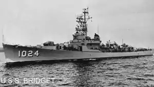 USS Bridget (DE-1024) was a Dealey-class destroyer escort in the United States Navy. She was named for Francis Joseph Bridget, a naval aviator who served on the Commander's Staff of Patrol Wing 10[1] during the Japanese attack on the Philippines on 8 December 1941. He was taken prisoner with the American forces on Bataan and was killed 15 December 1944 when a Japanese prison ship in which he was embarked was sunk off Olongapo, Luzon, Philippine Islands.