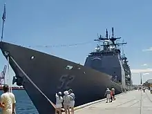 USS Bunker Hill (CG-52) is a Ticonderoga-class guided missile cruiser of the United States Navy constructed by Litton-Ingalls Shipbuilding Corporation at Pascagoula, Mississippi and launched on 11 March 1985. The Ticonderoga-class cruisers are equipped with the Aegis Combat System and Bunker Hill is the first of the class to be equipped with the Mark 41 Vertical Launching System (VLS) in place of the previous ships' twin-arm Mark 26 missile launchers, which greatly improved the flexibility and firepower of the ships by allowing them to fire BGM-109 Tomahawk cruise missiles for land attack missions. Other missions include ballistic missile defence and capital ship escort for anti-aircraft defense. The ship was commissioned on 20 September 1986 and is homeported at Naval Base San Diego in San Diego, California.