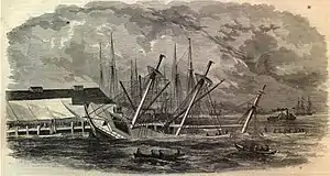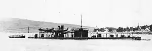 USS Camanche was a Passaic-class monitor that was prefabricated at Jersey City, New Jersey by Donahue, Ryan and Secor[1] for the sum of 613,164.98 dollars ($8.14 million in present day terms).[2] She was disassembled and shipped around Cape Horn in the sailing ship Aquila to San Francisco, California. Aquila arrived in San Francisco on 10 November 1863[1] but sank at her wharf in 30 feet of water on 14 November 1863 as a result of storm damage and a collision with another ship.[3] The monitor's parts were salvaged and she was launched on 14 November 1864. Camanche was commissioned in May 1865, Lieutenant Commander Charles J. McDougal in command.